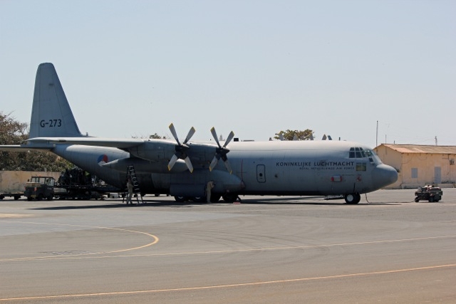 See on the right a Dutch Hercules of the 336th squadron. Normally stationed at Eindhoven Air Base, this picture was shot this week in Dakar, Senegal, where the Dutch transport aircraft carried material to Africa for - among others - a German advisory team, that trains the armed forces of the Senegalese army.