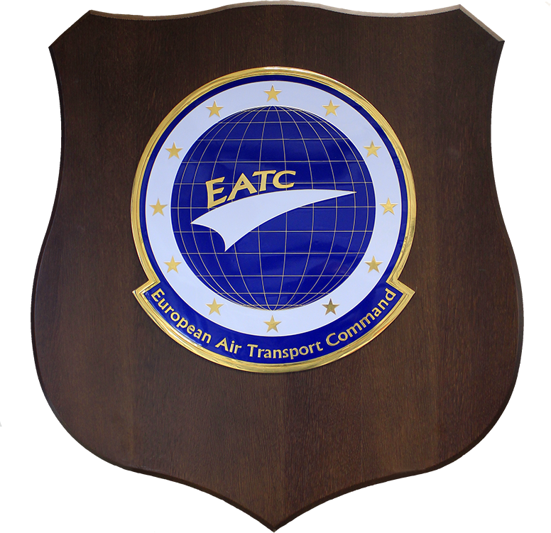 The coat of arms shows the globe as a grid which is overdrawn by a stylised white bridge carrying the acronym "EATC" in yellow letters. The globe is framed by a white ring with 12 yellow stars and is supported by the lettering "European Air Transport Command". In order to stress our multinational framework and to express our aim to reach a new level of cooperation, the core subject gets framed by 12 European stars.